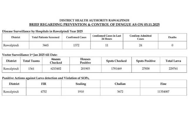 راولپنڈی میں ڈینگی کے 11 نئے کیسز رپورٹ، مجموعی تعداد 1372 تک پہنچ گئی