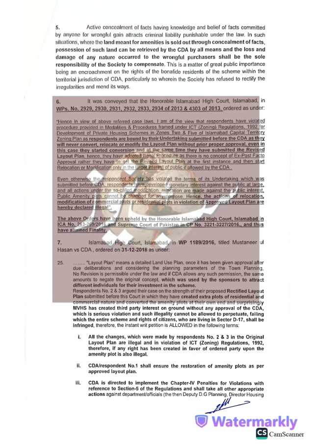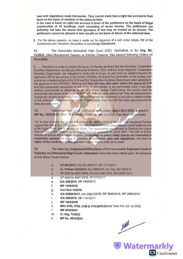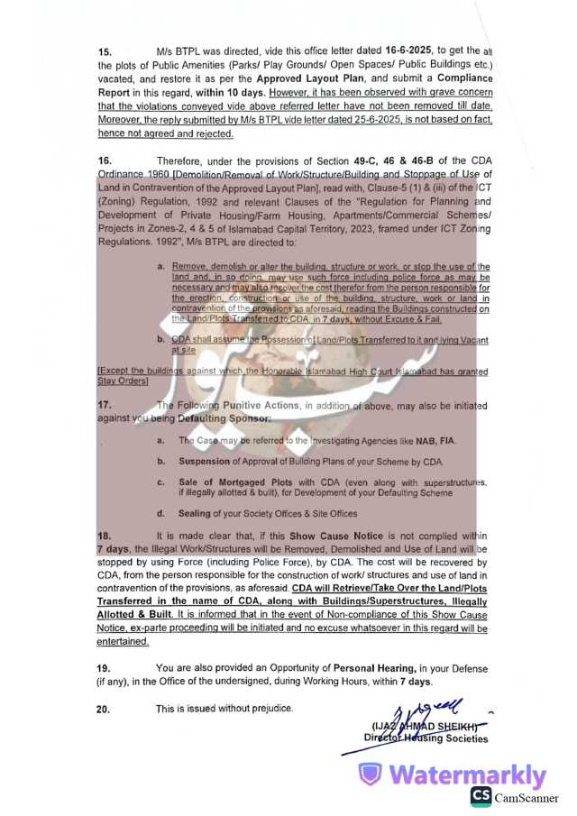 نوٹس میں کہا گیا ہے کہ بحریہ ٹاؤن کو یہ اسکیم 30 اگست 2000 کو مشروط اجازت کے تحت منظور کی گئی تھی، جبکہ 5 جولائی 2001 کو سی ڈی اے نے ہاؤسنگ اسکیم کے لیے این او سی بھی جاری کیا تھا۔ اسکیم کی تکمیل کے لیے 5 سال کا وقت دیا گیا تھا، تاہم 19 سال گزر جانے کے باوجود بحریہ ٹاؤن مطلوبہ انفراسٹرکچر مکمل کرنے میں ناکام رہا۔سی ڈی اے کے مطابق فیلڈ وزٹ کے دوران یہ بات سامنے آئی کہ بحریہ ٹاؤن نے منظور شدہ لے آؤٹ پلان کی خلاف ورزی کرتے ہوئے عوامی پلاٹس کو دیگر مقاصد کے لیے استعمال کیا۔ نوٹس میں بحریہ ٹاؤن کو ہدایت کی گئی ہے کہ وہ اس معاملے پر وضاحت پیش کرے۔