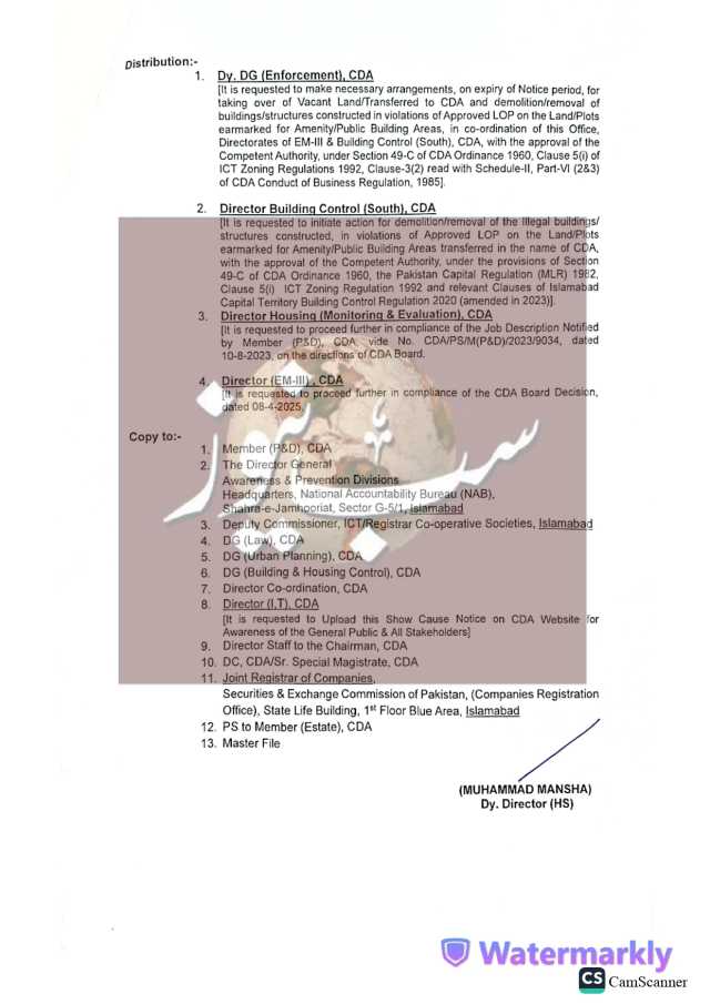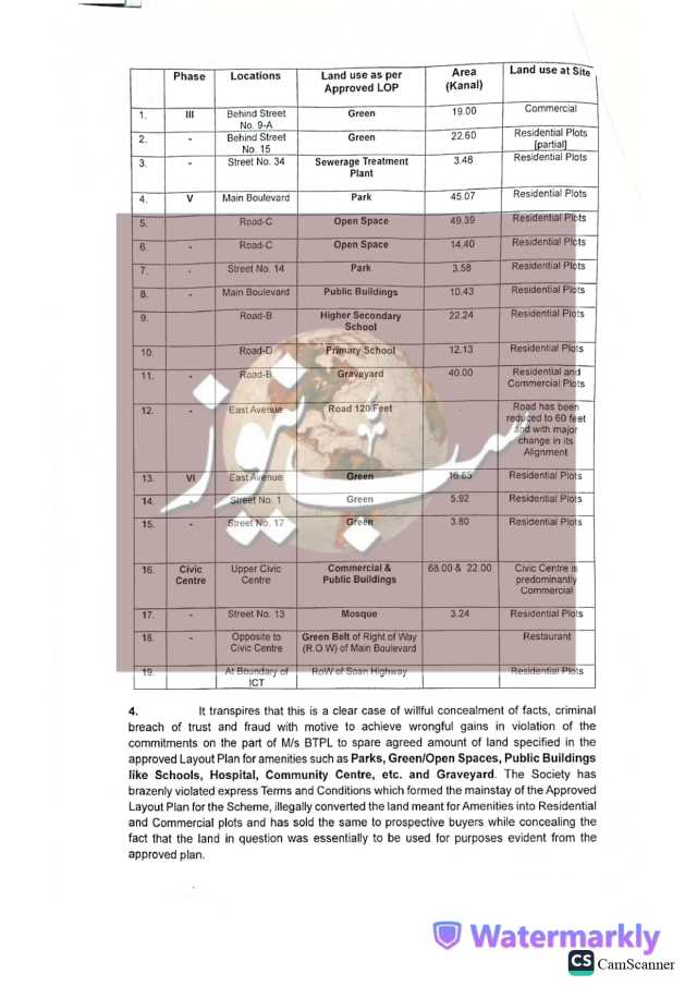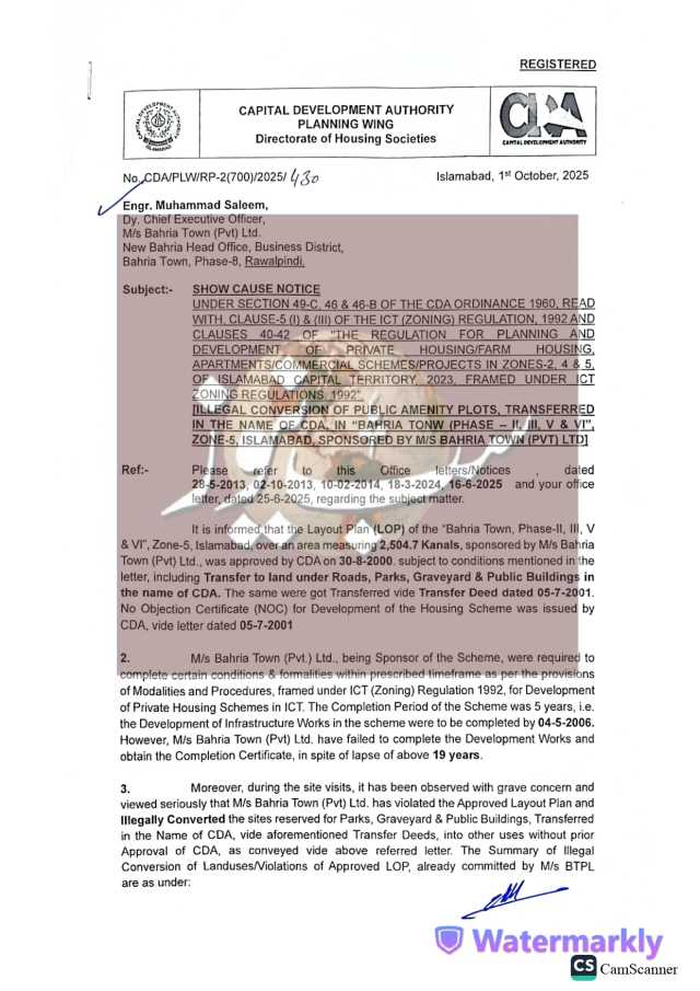 سی ڈی اے کی جانب سے جاری نوٹس کے مطابق بحریہ ٹاؤن (پرائیویٹ) لمیٹڈ نے اسلام آباد کے زون فائیو میں واقع “بحریہ ٹاؤن فیز II, III, V اور VI” میں سی ڈی اے کے نام پر منتقل شدہ پلاٹس، جنہیں سڑکوں، پارکس، قبرستان اور عوامی عمارتوں کے لیے مختص کیا گیا تھا، غیر قانونی طور پر تجارتی استعمال میں لے لیا۔