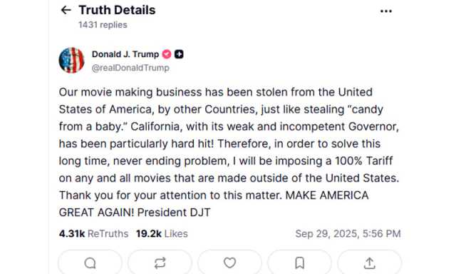 صدر ٹرمپ نے اپنی سوشل میڈیا ایپ ’ٹرتھ سوشل‘ پر لکھا کہ امریکا کی فلم سازی کی صنعت غیر ملکی مقابلے کے ہاتھوں پیچھے جا رہی ہے۔ ان کا کہنا تھا کہ امریکا کی فلم انڈسٹری کو دیگر ممالک نے ایسے لوٹا ہے جیسے کسی بچے سے کینڈی چھین لی جائے۔