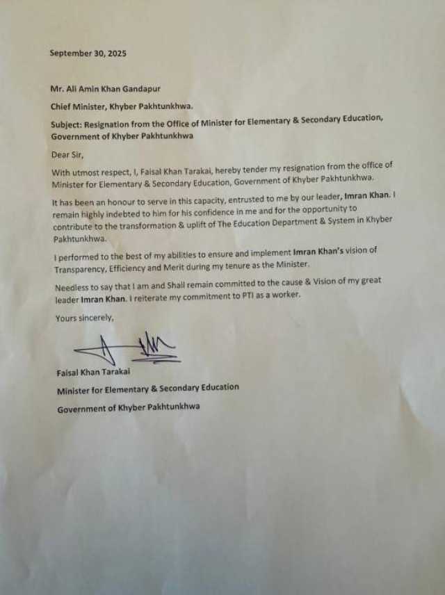 صوبائی وزیر برائے تعلیم فیصل خان ترکئی اور وزیر آبپاشی عاقب اللہ خان نے کابینہ سے استعفی دے دیا ،دونوں وزرا نے بطور احتجاج علی امین گنڈا پور کی کابینہ سے استعفی دیا۔