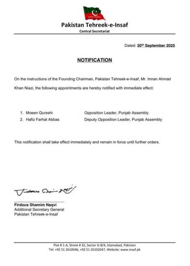 ایڈیشنل سیکرٹری جنرل پی ٹی آئی فردوس شمیم نقوی نے نوٹیفکیشن جاری کردیا۔