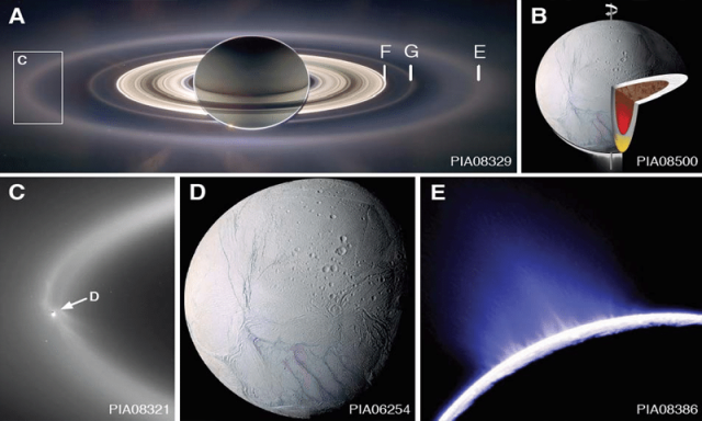ان میں شامل ننھے برفیلے ذرات جو ریت کے ذروں سے بھی چھوٹے تھے زحل کے ’ای رِنگ‘ میں شامل ہو رہے تھے جنہیں کیسینی نے اپنے کاسمک ڈسٹ اینالائزر سے ریکارڈ کیا۔