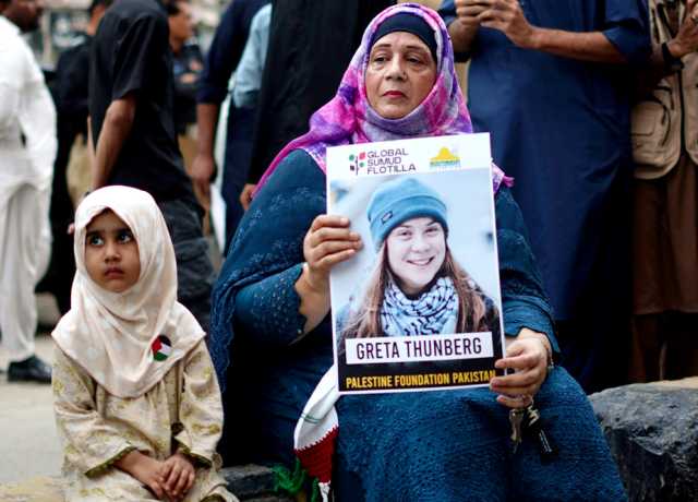 شرکاء نے امریکا مردہ باد، اسرائیل نامنظور اور فلسطین کی آزادی کے نعرے لگائے۔ مظاہرین نے ہاتھوں میں پلے کارڈز اور بینرز اٹھا رکھے تھے، جن پر صمود فلوٹیلا کی حمایت میں نعرے درج تھے۔ چھوٹی تصاویر تصاویر کی فہرست سلائیڈ شو