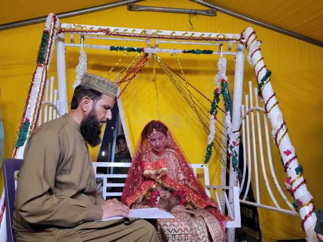 21 سالہ طیبہ، جو پہلے ایک فیکٹری میں کام کرتی تھیں اور اب خیمہ بستی میں قائم الخدمت اسکول میں بچوں کو پڑھاتی ہیں، اپنی سادگی اور مسکراہٹ کے ساتھ دلہن بنیں۔ شادی کی تقریب میں خیمہ بستی کے دیگر مکینوں سے بڑھ کر طیبہ کے شاگرد بچے شریک ہوئے۔