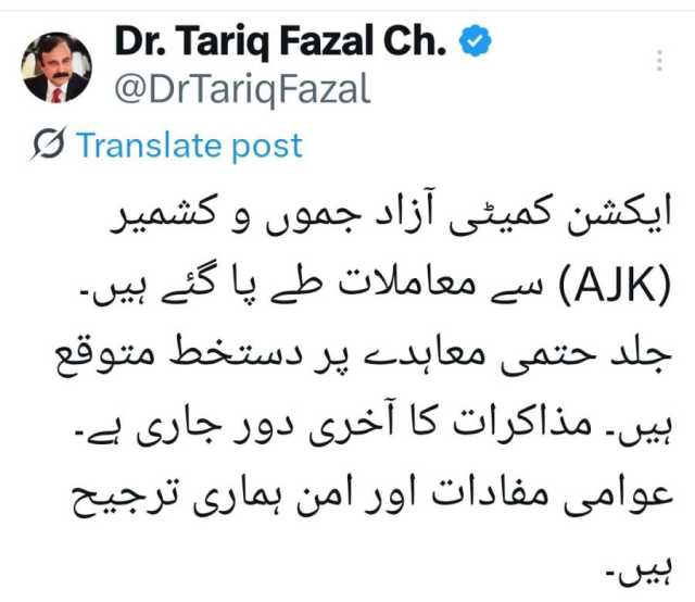 طارق فضل چوہدری کے مطابق ایکشن کمیٹی آزاد جموں و کشمیر سے معاملات طے پا گئے ہیں۔ جلد حتمی معاہدے پر دستخط متوقع ہیں۔