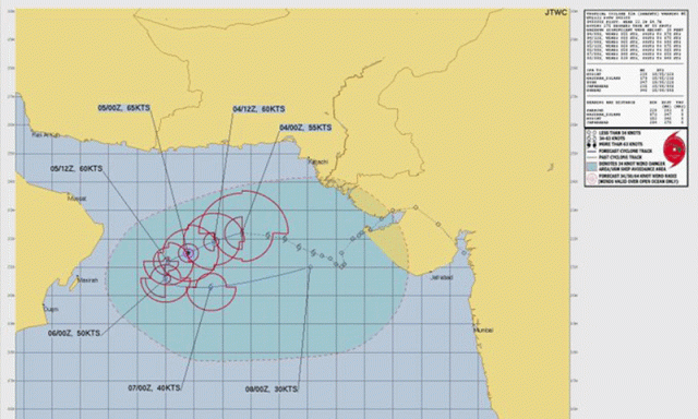 طوفان کے مرکز میں ہوا کی رفتار 75 کلومیٹر فی گھنٹہ ریکارڈ کی گئی ہے جبکہ امکان ہے کہ یہ سسٹم 6 اکتوبر تک بحیرہ عرب میں موجود رہے گا۔