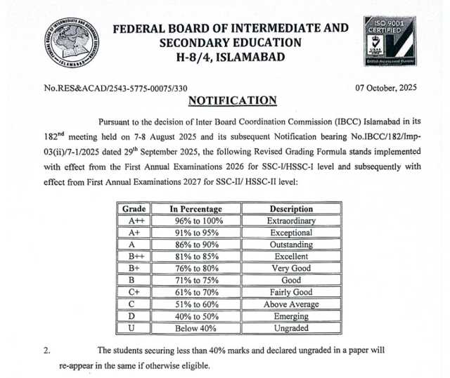 فیڈرل بورڈ آف انٹرمیڈیٹ اینڈ سیکنڈری ایجوکیشن (FBISE) نے امتحانی نتائج کے لیے نیا گریڈنگ فارمولا جاری کر دیا ہے، جو میٹرک (SSC) کے امتحانات پر 2026 سے اور ایف اے، ایف ایس سی (HSSC) کے امتحانات پر 2027 سے نافذ ہوگا۔