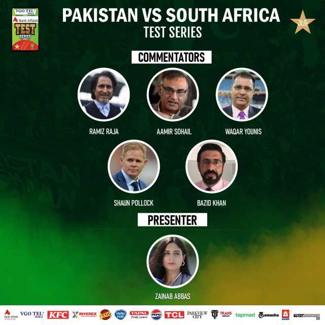 پاکستان اور جنوبی افریقہ کے درمیان 2 ٹیسٹ میچوں کی سیریز کے لیے نشریاتی انتظامات مکمل کر لیے گئے ہیں۔ سابق جنوبی افریقی کپتان شون پولاک کمنٹری ٹیم کا حصہ ہوں گے، جبکہ پاکستان کی جانب سے عامر سہیل، رمیز راجا، وقار یونس اور بازید خان تجزیہ کاروں میں شامل ہوں گے۔