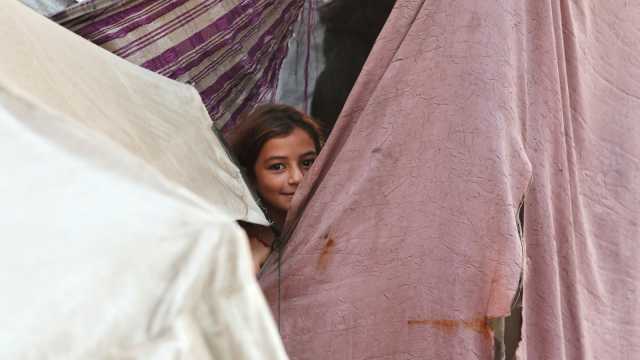 خان یونس کے ایک خیمے بچی مسکراتے ہوئے دیکھ رہی ہے