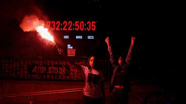 تل ابیب میں خاتون اور ایک مرد اسرائیلی قیدیوں کی تصویر کے سامنے ایک دوسرے سے گلے مل رہے ہیں