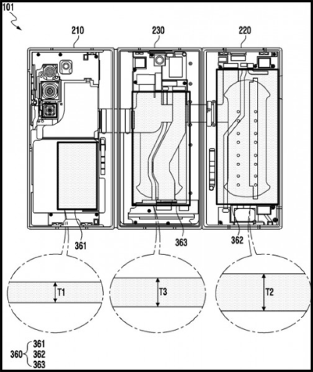 ڈاکیومنٹ کے مطابق چونکہ یہ ایک ٹرائی-فولڈنگ اسمارٹ فون ہے، اس میں تین خانے ہوں گے اور ہر خانے میں ایک بیٹری سیل ہوگا۔