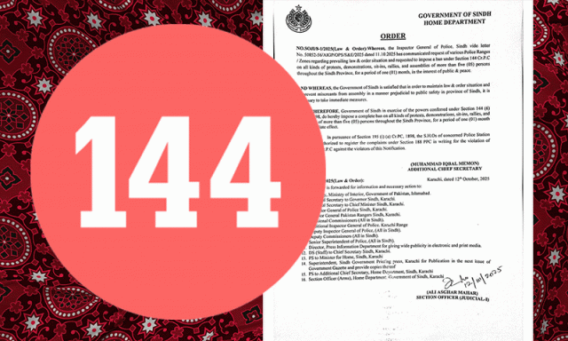 سندھ حکومت نے صوبے بھر میں امن و امان کی صورتحال کے پیش نظر ایک ماہ کے لیے دفعہ 144 نافذ کر دی۔ محکمہ داخلہ سندھ نے اس حوالے سے باضابطہ نوٹیفکیشن جاری کر دیا ہے۔