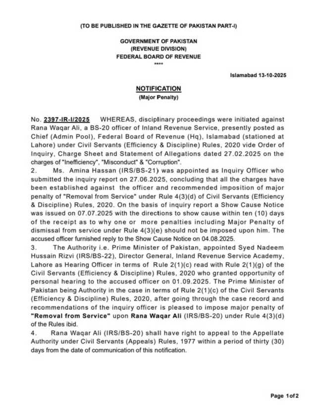 وزیراعظم کے حکم پر ایف بی آرکےگریڈ20کے اہلکار رانا وقارعلی کو ملازمت سےبرطرف کرنے کا نوٹیفیکیشن نکال دیا گیا۔