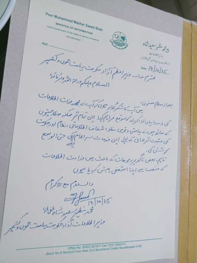 مظفرآباد: آزاد کشمیر کے وزیر اطلاعات پیر مظہر سعید شاہ نے اپنی وزارت اور عہدے سے استعفی دے دیا pic.