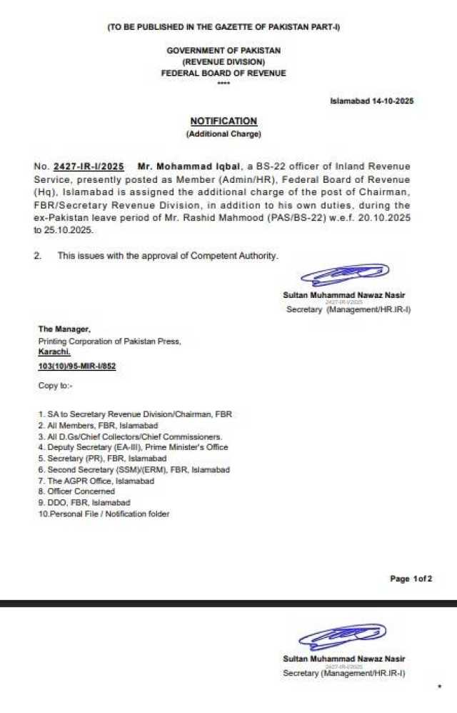 ان لینڈ ریونیو سروس گریڈ 22 کے محمد اقبال ایف بی آر میں ممبر ایڈمن و ایچ آر تعینات ہیں۔ایف بی آر نے نوٹیفکیشن جاری کردیا
