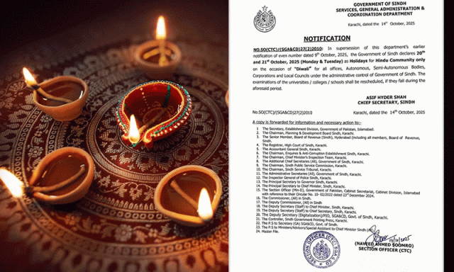 سندھ حکومت نے ہندو برادری کے مذہبی تہوار دیوالی کے موقع پر 20 اور 21 اکتوبر (پیر اور منگل) کو 2 روزہ تعطیلات کا اعلان کر دیا۔