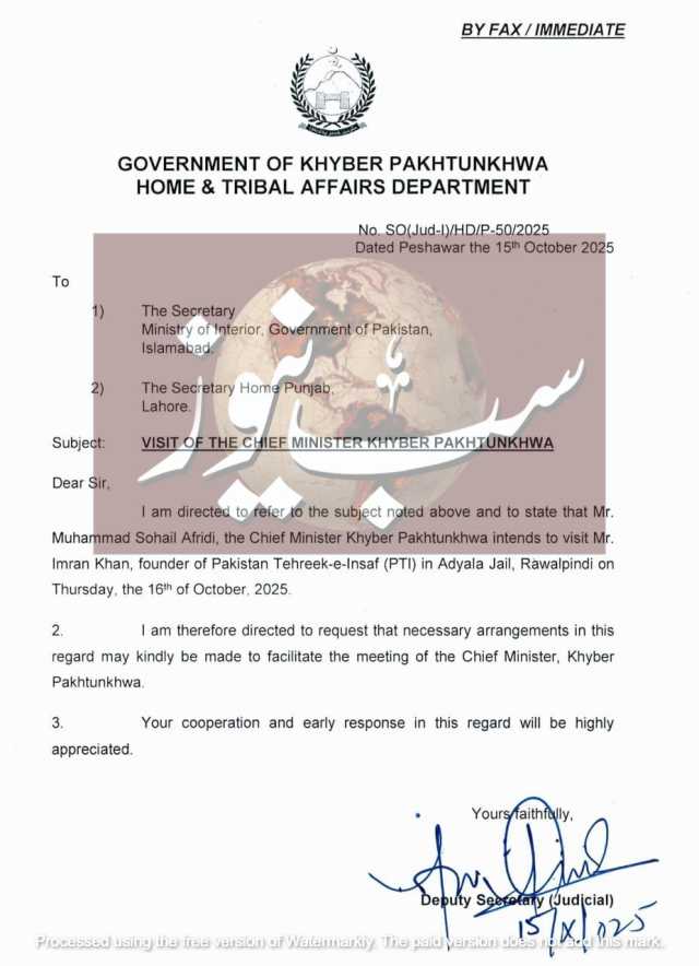 پشاور (آئی پی ایس )نو منتخب وزیر اعلی خیبر پختونخوا محمد سہیل آفریدی کا اپنے عہدے کا حلف لینے کے فوری بعد بانی چیئر مین پی ٹی آئی عمران خان سے ملاقات کا فیصلہ،وزیر اعلی کا عمران خان سے ملاقات کے لئے کل 16 اکتوبر کو اڈیالہ جانے کا فیصلہ ،وزیر اعلی کی عمران خان سے ملاقات کے انتظامات کے لئے صوبائی حکومت نے وفاقی اور پنجاب حکومتوں کو باقاعدہ مراسلہ ارسال کردیا،اس سلسلے میں محکمہ داخلہ خیبر پختونخوا نے وفاقی سیکرٹری داخلہ اور سیکرٹری داخلہ پنجاب کو مراسلہ ارسال کیا،مراسلے کے مطابق وزیر اعلی کی عمران خان سے ملاقات کروانے کے لیے ضروری انتظامات کیے جائیں۔