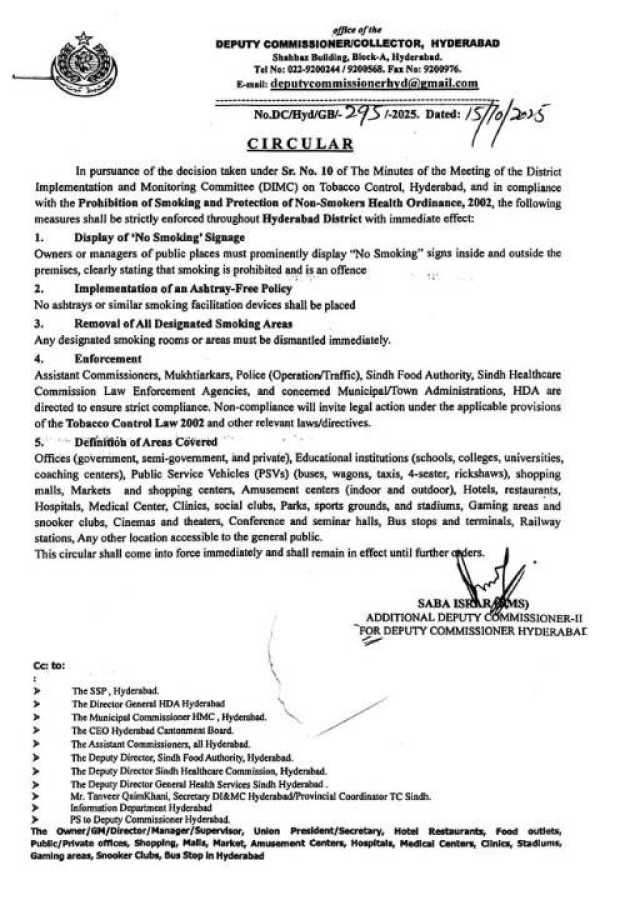 حیدر آباد میں ڈسٹرکٹ امپلیمینٹیشن و مانیٹرنگ کمیٹی برائے تمباکو کنٹرول کے اجلاس میں فیصلہ کیا گیا۔ انسدادِ تمباکو نوشی اور غیر تمباکو نوش افراد کے تحفظ آرڈیننس 2002 پر عمل درآمد کو یقینی بنانے کیلئے نوٹیفکیشن جاری کردیا گیا ۔