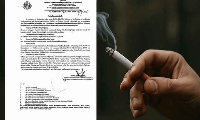 ڈپٹی کمشنر حیدرآباد کی جانب سے جاری اعلامیہ کے مطابق ضلع بھر میں انسدادِ تمباکو نوشی آرڈیننس 2002 پر سختی سے عمل درآمد شروع کر دیا گیا ہے۔