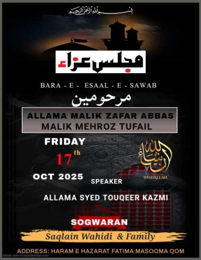 اسلام ٹائمز۔ قم المقدسہ حرم حضرت فاطمہ معصومہ سلام علیہا میں بزرگ عالم دین سرمایہ ملت جعفریہ پاکستان، مبلغ مکتب اہل بیت عصمت و طہارت مرحوم و مغفور علامہ ملک ظفر عباس (برطانیہ) اور مرحوم ملک مہروز طفیل کے لئے ایک مجلس ایصال ثواب کا اہتمام کیا گیا۔ مجلس عزاء سے خطاب کرتے ہوئے علامہ ڈاکٹر سید توقیر عباس کاظمی نے علم و عالم کی اہمیت بیان کرتے ہوئے علامہ ظفر عباس مرحوم کی دین مبین کے راستے میں انجام دی گئی خدمات کو سراہا۔ مجلس عزاء کے بعد پاکستان سے تشریف لائے ہوئے بزرگ عالم دین امام خمینی ٹرسٹ کے بانی علامہ سید افتخار حسین نقوی نے مرحومین کے لئے دعائے مغفرت فرمائی، جبکہ پروگرام کے آخر میں مرحومین کے لئے اجتماعی فاتحہ خوانی بھی کی گئی۔.ذریعہ: Islam Times