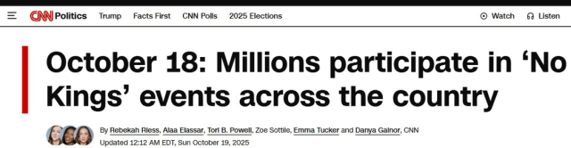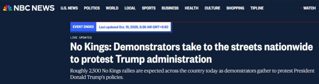 امریکہ کے درجنوں شہروں میں ہفتے کی شام اور آج صبح (ہفتہ کے امریکی وقت کے مطابق) "نو کنگز" کے عنوان سے امریکی صدر ڈونلڈ ٹرمپ کے خلاف بڑے پیمانے پر مظاہرے ہوئے ہیں۔ ان عوامی اور مربوط مظاہروں کی دوسری لہر نے ٹرمپ کے حامیوں کو ششدر کردیا ہے۔ Axios ویب سائٹ نے امریکہ بھر میں ان مظاہروں میں حصہ لینے والوں کی تعداد 7 ملین بتائی ہے۔ یہ مظاہرے، جو واشنگٹن، ڈی سی سے لے کر نیویارک، لاس اینجلس اور چھوٹے شہروں تک پھیلے ہوئے تھے، منتظمین کے مطابق، ٹرمپ انتظامیہ کے "بڑھتے ہوئے آمریت" اور "آمرانہ اقدامات" کے خلاف سخت مخالفت کا اظہار کرنے کے لیے منعقد کیے گئے۔