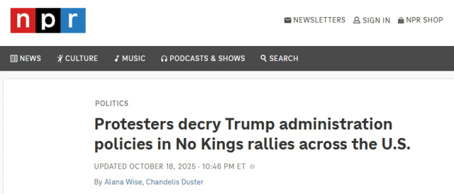 اس بارے معروف امریکی ای مجلے این پی آر (NPR) نے بھی احتجاجی مظاہروں کی اصلی وجہ پر روشنی ڈالتے ہوئے لکھا ہے کہ بنیادی وجہ یہ ہے کہ امریکی صدر کی جانب سے منتخب عہدیداروں کے ساتھ "بادشاہوں جیسا" برتاؤ کیا جا رہا ہے جبکہ نیویارک شہر میں احتجاجی ریلیوں کے دوران عوام نے ایسے ایسے پلے کارڈز بھی اٹھا رکھے تھے کہ جن پر "نہ تاج اور نہ ہی بادشاہ" تحریر تھا۔