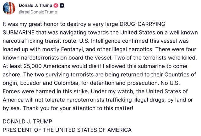 ٹرمپ نے سوشل میڈیا پلیٹ فارم ٹرتھ سوشل پر بیان میں کہا کہ میرے لیے یہ اعزاز کی بات ہے کہ ایک بڑی منشیات بردار آبدوز کو تباہ کیا گیا جو فینٹانائل اور دیگر منشیات سے بھری ہوئی تھی۔ 2 دہشت گرد مارے گئے جبکہ دو کو ان کے ممالک واپس بھیجا جا رہا ہے۔ اگر آبدوز امریکا پہنچ جاتی تو 25000 امریکی (منشیات سے) مر جاتے۔