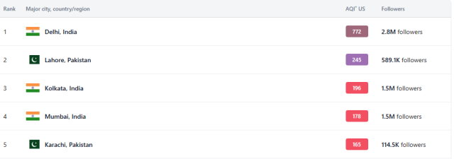 عالمی ماحولیاتی ادارے آئی کیو ایئر کے مطابق لاہور اس وقت دنیا کے آلودہ ترین شہروں میں پہلے اور بھارتی دارالحکومت دہلی دوسرے نمبر پر ہے، جہاں لاہور کا اے کیو آئی 298 اور دہلی کا 283 ریکارڈ کیا گیا۔