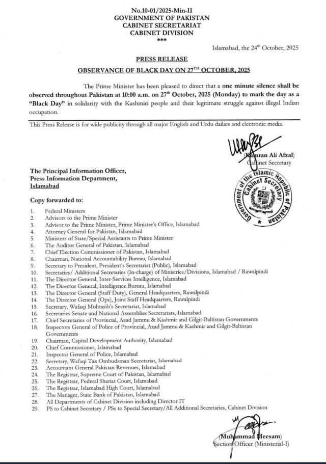 وزیراعظم محمد شہباز شریف کی ہدایت پر وفاقی حکومت نے 27 اکتوبر کو جموں و کشمیر پر غیر قانونی بھارتی قبضے کے خلاف ’یومِ سیاہ‘ منانے کا نوٹیفکیشن جاری کر دیا۔