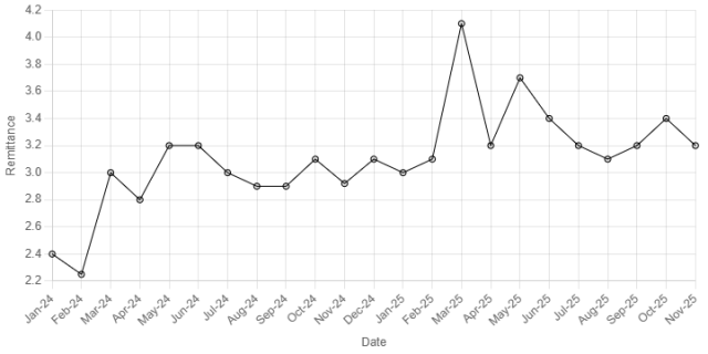 اسٹیٹ بینک آف پاکستان کے جاری کردہ اعداد و شمار کے مطابق، بیرونِ ملک مقیم پاکستانیوں نے نومبر 2025 میں 3.2 ارب ڈالر وطن بھیجے۔ گزشتہ سال نومبر کے مقابلے میں ترسیلات زر میں 9.4 فیصد اضافہ ریکارڈ کیا گیا، البتہ اکتوبر 2025 کے 3.4 ارب ڈالر کے مقابلے میں ماہانہ بنیادوں پر 7 فیصد کمی ہوئی۔