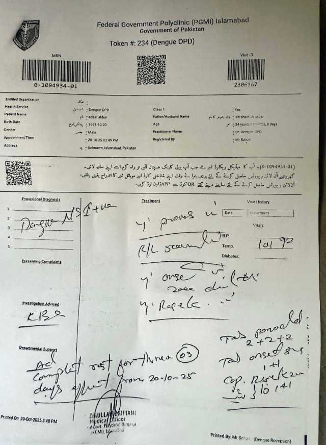 میڈیکل رپورٹ کے مطابق ایس پی عدیل اکبر نے 20 اکتوبر کو پولی کلینک سے چیک اپ کرایا تھا، ڈینگی پوزیٹیو آنے کے بعد ایس پی عدیل اکبر نے 3 روز کی چھٹی کی درخواست دی تھی، ڈی آئی جی اسلام آباد نے عدیل اکبر کی چھٹی منظور کر لی تھی۔