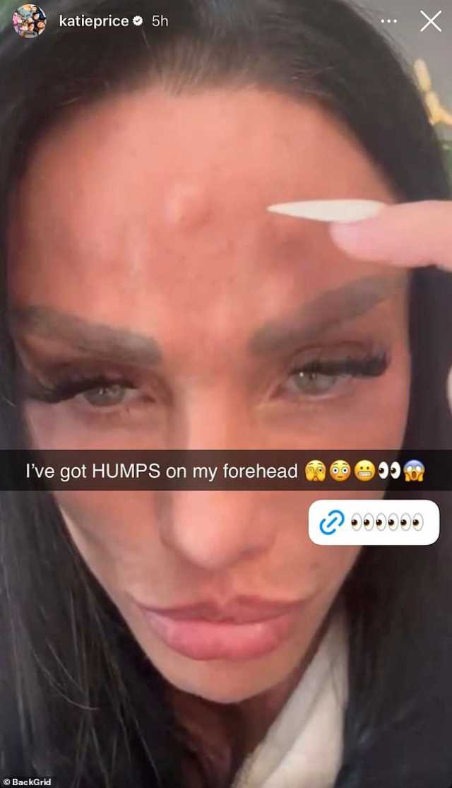 برطانوی ماڈل اور ٹی وی اسٹار کیٹی پرائس نے حال ہی میں سوشل میڈیا پر اپنی ایک تصویر شیئر کی ہے جس میں ان کی پیشانی پر نمایاں تبدیلی ’ہَمپس‘ دیکھے جا سکتے ہیں۔ کیٹی پرائس کے مطابق یہ دانے نما نشانات حالیہ بوٹوکس ٹریٹمنٹ کے نتیجے میں ظاہر ہوئے ہیں۔