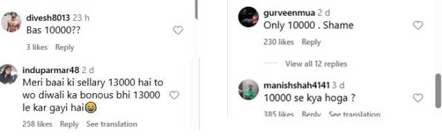 گورو نامی صارف کا کہنا تھا کہ صرف 10 ہزار ، شرم آنی چاہیے، جبکہ ایک نے لکھا کہ 10 ہزار سے کیا ہوگا؟