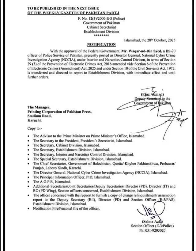 اسٹیبلشمنٹ ڈویژن نے نیشنل سائبر کرائم انویسٹی گیشن ایجنسی کے ڈائریکٹر جنرل وقار الدین سید کو عہدے سے ہٹا دیا ہے اور ان کی جگہ سید خرم علی کو ڈائریکٹر جنرل، نیشنل سائبر کرائم انویسٹی گیشن ایجنسی تعینات کر دیاہے۔