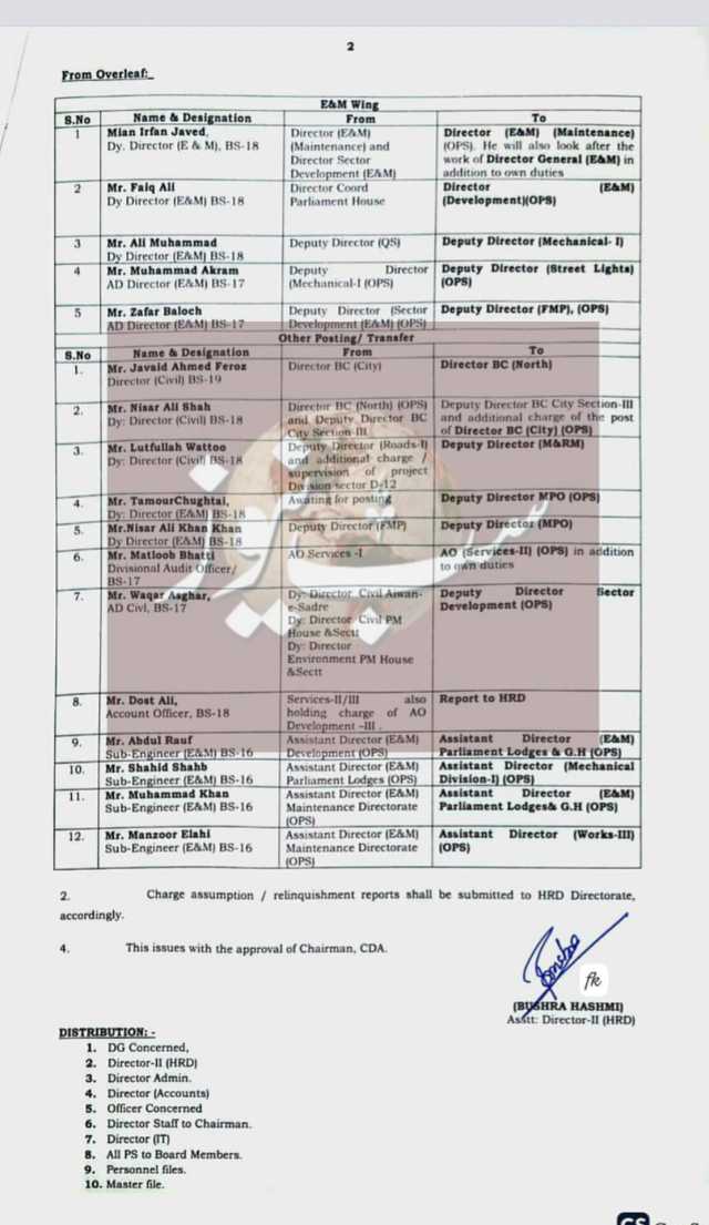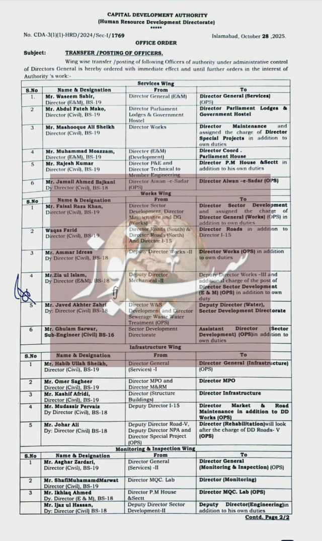 سی ڈی اے میں بڑے پیمانے پر اکھاڑ پچھاڑ، انجینئرنگ ونگ اور بلڈنگ کنٹرول میں تقرری و تبادلے ،۔نوٹیفکیشن سب نیوز پر