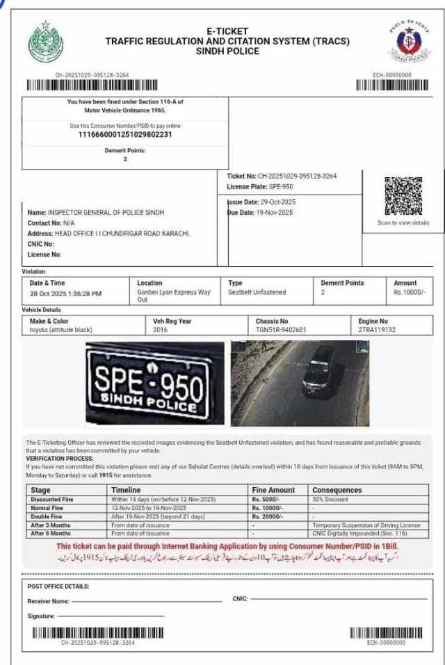کراچی: ڈی آئی جی ٹریفک کے زیر استعمال سرکاری گاڑی کا بھی ای چالان ہوگیا