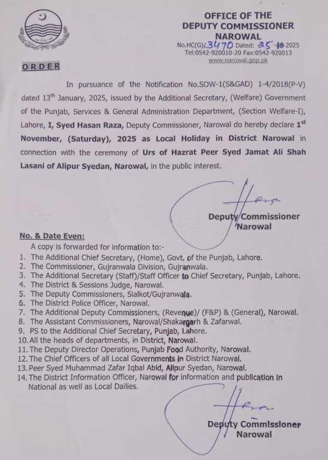 ویب ڈیسک:ڈپٹی کمشنر نارووال سید حسن رضا نے اعلان کیا ہے کہ حضرت پیر سید جماعت علی شاہ لاثانی آف علی پور سیداں شریف کے سالانہ عرس مبارک کے موقع پر یکم نومبر بروز ہفتہ ضلع بھر میں عام تعطیل ہوگی۔