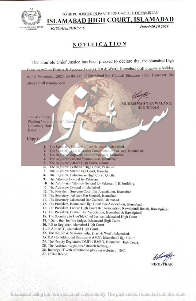 اسلام آباد بار کونسل کے انتخابات کیلئے یکم نومبر کو اسلام آباد ہائیکورٹ اور ماتحت عدالتوں میں تعطیل کا اعلان
