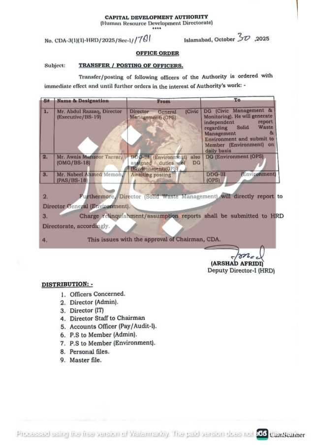 ڈپٹی ڈائریکٹر جنرل تھری (انوائرمنٹ ) اویس منظور تارڑ کو ڈی جی انوائرمنٹ کا چارج سونپ دیا گیا ہے ، علاوہ ازیں تقرری کے منتظر گریڈ 18کے افسر نبیل احمد میمن کو ڈپٹی ڈائریکٹر جنرل تھری (انوائرمنٹ ) کا چارج سونپ دیا گیا ہے ۔ سی ڈی اے کی طرف سے تمام تقرریوں کا نوٹیفکیشن بھی جاری کر دیا گیا ہے ۔
