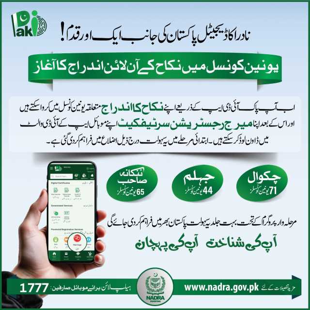نادرا کی جانب سے جاری بیان میں کہا گیا کہ پاک آئی ڈی موبائل ایپ کے ذریعے نکاح کا اندراج متعلقہ یونین کونسل میں کروا یا جا سکتا ہے، اس کے بعد اپنا میرج رجسٹریشن سرٹیفیکیٹ موبائل ایپ کے آئی ڈی والٹ میں ڈاؤن لوڈ کر سکتے ہیں۔