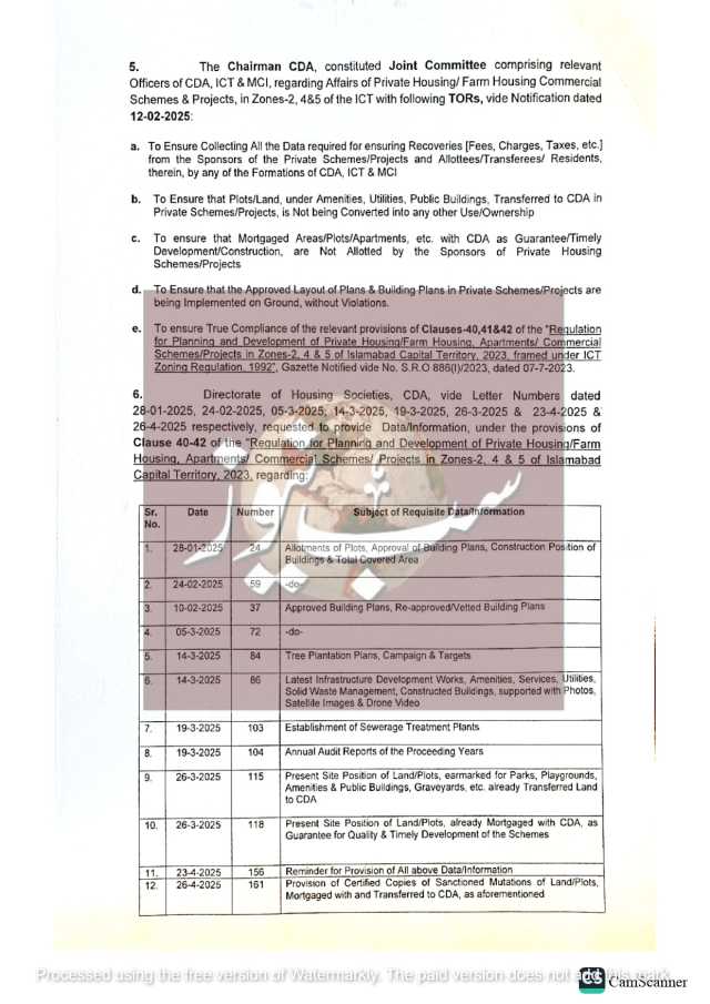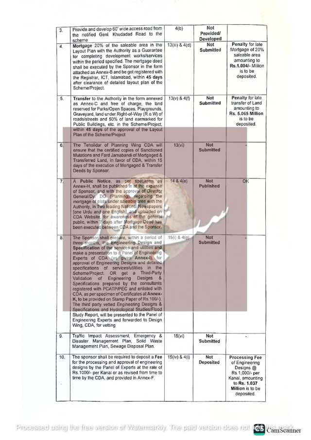 سی ڈی اے کے مطابق، اسپانسرز کو ہدایت کی گئی تھی کہ:منظور شدہ پلان کو اردو اور انگریزی کے دو قومی اخبارات میں 7 دن کے اندر شائع کیا جائے تاکہ عوام کو آگاہی دی جا سکے۔منصوبے کے ڈیزائن، پلاننگ اور نفاذ سے متعلق شرائط کو تسلیم کرنے کا تحریری حلف نامہ جمع کرایا جائے۔تاہم، رپورٹ کے مطابق دونوں میں سے کوئی بھی شرط پوری نہیں کی گئی اور ان کا اسٹیٹس “نوٹ پبلشڈ” اور “نوٹ سبمٹڈ” درج کیا گیا ہے۔سی ڈی اے نے واضح کیا ہے کہ اگر مقررہ شرائط پوری نہ کی گئیں تو دونوں کمپنیوں کے خلاف مزید کارروائی عمل میں لائی جائے گی۔