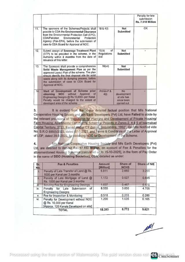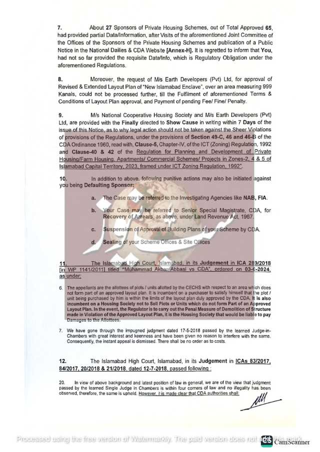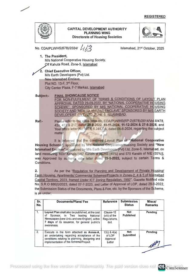 نوٹس کے مطابق، دونوں کمپنیوں نے اپنے مشترکہ ہاؤسنگ منصوبے “نیشنل کوآپریٹو ہاؤسنگ اسکیم” اور “نیو اسلام آباد انکلیو” کے لیے 29 ستمبر 2022 کو منظور شدہ لی آؤٹ پلان (Layout Plan) کی شرائط و ضوابط پر عمل درآمد نہیں کیا۔دستاویز کے مطابق منصوبہ زون فائیو اسلام آباد میں واقع ہے اور مجموعی طور پر 1037 کنال پر مشتمل ہے، جس میں سے نیشنل کوآپریٹو ہاؤسنگ سوسائٹی کے 467 کنال (45%) اور ارتھ ڈویلپرز کے 570 کنال (55%) شامل ہیں۔