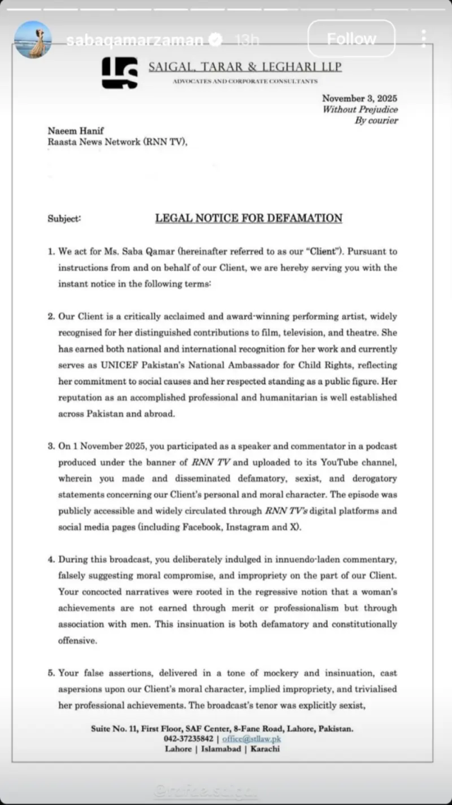 صبا قمر نے ان تمام دعوؤں کو جھوٹا اور بے بنیاد قرار دیا ہے اور انسٹاگرام اسٹوری پر قانونی نوٹس کی تفصیلات بھی شیئر کیں۔