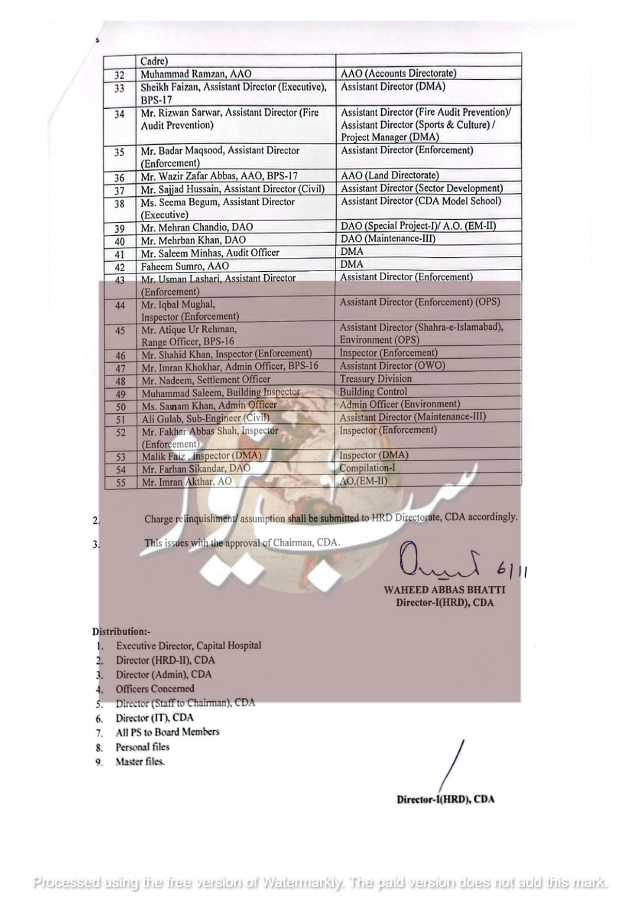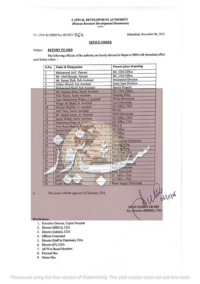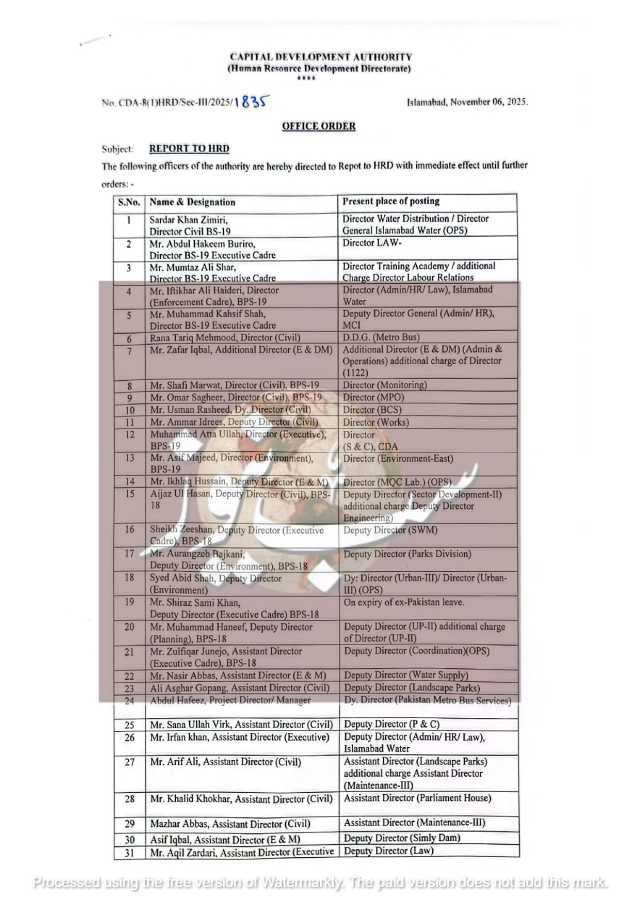 اس حوالے سے دفترِ ترقی انسانی وسائل کی جانب سے باضابطہ آفس آرڈر نمبر 835 جاری کیا گیا ہے۔نوٹیفکیشن کے مطابق افسران کو ان کے موجودہ عہدوں سے ہٹا کر ایچ آر ڈی کو رپورٹ کرنے کی ہدایت کی گئی ہے۔ان میں شامل نمایاں افسران سردار خان زمری ، ڈائریکٹر واٹر ڈسٹری بیوشن / جنرل اسلام آباد و،اٹرعبدالحکیم بُریو، ڈائریکٹر لاءممتاز علی شاہ، ڈائریکٹر ٹریننگ اکیڈمی ،افتخار علی حیدری، ڈائریکٹر ایڈمن/ ایچ آر لاءمحمد کاشف شاہ، ڈپٹی ڈائریکٹر جنرل (ایڈمن / ایچ آر) ایم سی آئی ،رانا طارق محمود، ڈی ڈی جی میٹرو بس ،ظفر اقبال، ایڈیشنل ڈائریکٹر (ای اینڈ ڈی ایم)،شفیع مروت، ڈائریکٹر مانیٹرنگ ،عمر صغیر، ڈائریکٹر ایم پی او،عثمان رشید، ڈائریکٹر بی سی ایس جبکہ دیگر افسران میں مختلف شعبوں جیسے واٹر سپلائی، پارکس، انوائرمنٹ، پلاننگ، اور انجینئرنگ سے تعلق رکھنے والے ڈپٹی و اسسٹنٹ ڈائریکٹرز بھی شامل ہیں۔