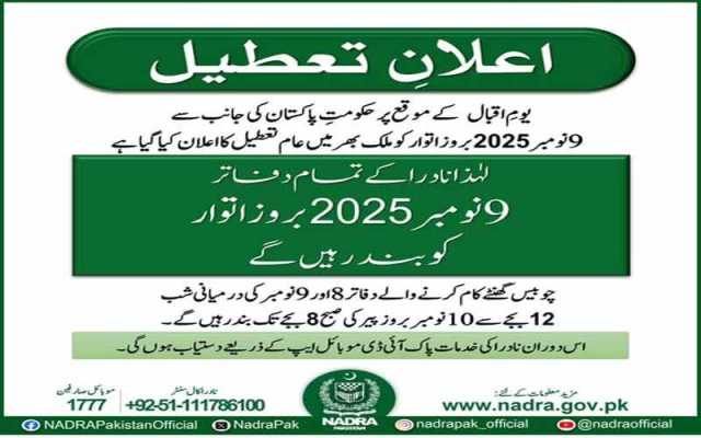 سرکاری اعلامیے کے مطابق نادرا کے تمام دفاتر پورے دن کے لیے بند رہیں گے اور معمول کے مطابق پیر 10 نومبر 2025 سے اپنی سرگرمیاں دوبارہ شروع کریں گے۔