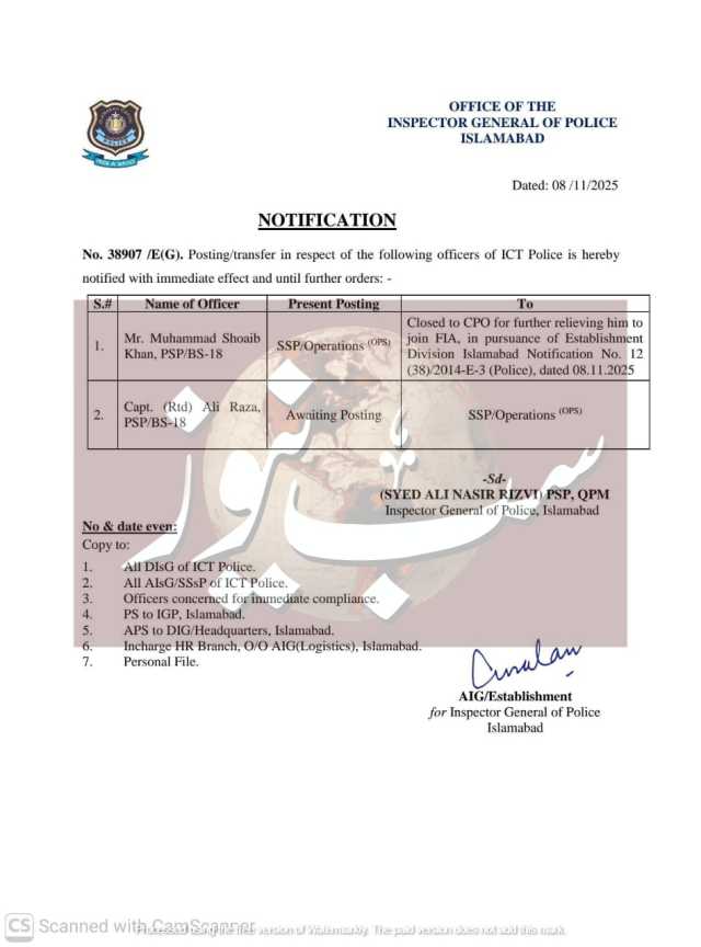 اسلام آباد (سب نیوز )کیپٹن ریٹائرڈ علی رضا کو ایس ایس پی آپریشنز اسلام آباد تعینات کر دیا گیا،جواد طارق کے ایف آئی اے تبادلے کے باعث ڈی آئی جی اسلام آباد کی سیٹ تقرری کی منتظر آئی جی اسلام آباد علی ناصر رضوی کی جانب سینوٹیفکیشن جاری کر دیا گیا۔
