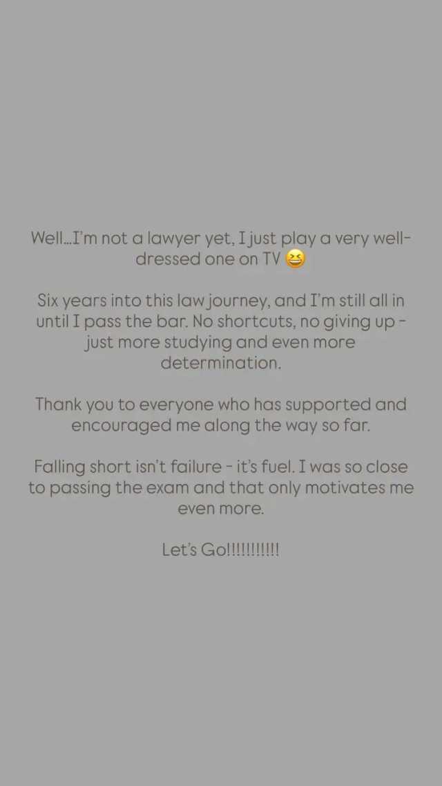 فوٹوز اینڈ ویڈیوز شیئرنگ پلٹ فارم انسٹاگرام پر اسٹوری شیئر کرتے ہوئے انہوں نے انکشاف کیا کہ وہ وکالت کا امتحان پاس نہیں کرسکیں۔