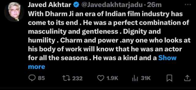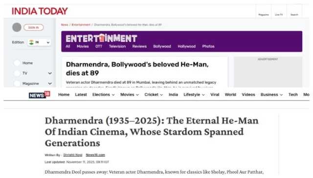بھارتی میڈیا میں خبریں سامنے آرہی ہیں کہ بالی ووڈ کے لیجنڈری اداکار دھرمیندر 89 سال کی عمر میں چل بسے۔