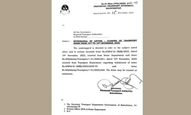 یہ بھی پڑھیں: بلوچستان: سیکیورٹی خدشات کے پیش نظر 12 تا 14 نومبر بس سروس معطل، مسافروں کے لیے مشکلات